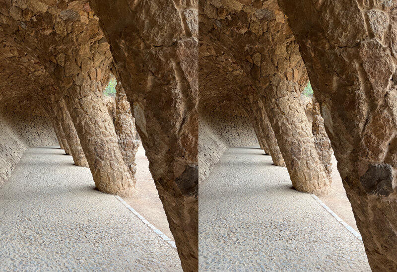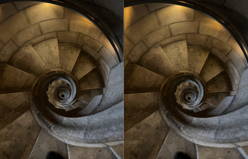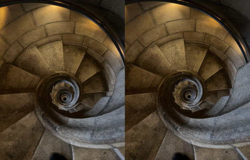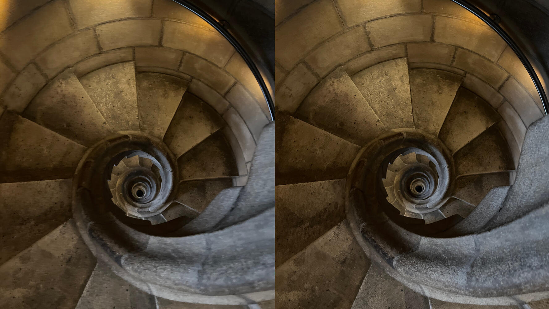 The Sagrada Familia, Spanish architect Antoni Gaudí’s masterpiece, is a visual stunner inside and out. Rising above the main structure are numerous towers, some of which you can explore.You're taken up via elevator, then descend by foot, roughly 400 steps, down a narrow spiral staircase.The moment I stepped into this space I knew I had to try to capture it in 3D. Since I shoot cha-cha style, the challenge would be stealing a few seconds - every few steps - to try to get a strong pair of consecutive exposures.There was no time to stop and evaluate as I went; it was shoot and go... All the while taking care to avoid a potentially perilous misstep or - worse - dropping my camera!