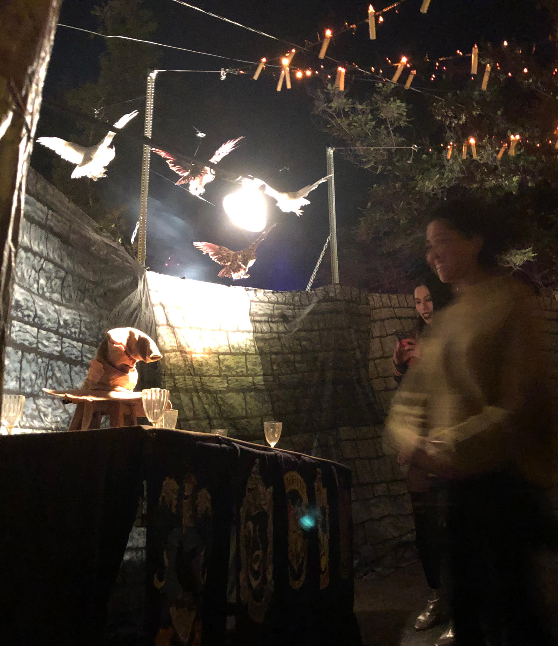 My family's contribution is an immersive Harry Potter display. Each year we add a new element or two, inspired by scenes and characters in the books and films.Most of what we do is either entirely home-made (there's a lot of PVC behind the scenes), or a repurposed and/or significantly modified/enhanced prop. (That's a big part of the satisfaction for us; devising and building our own scenes.)